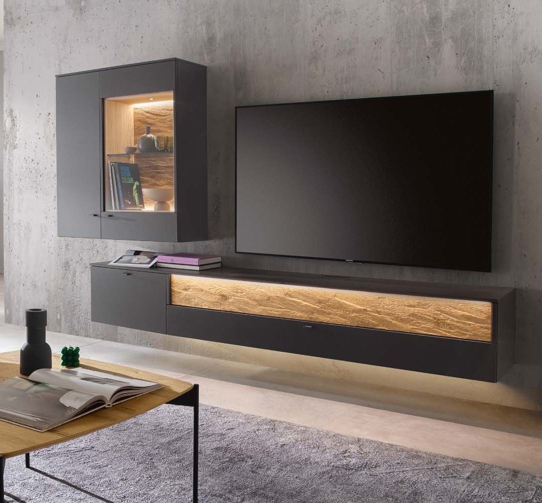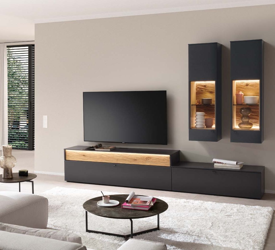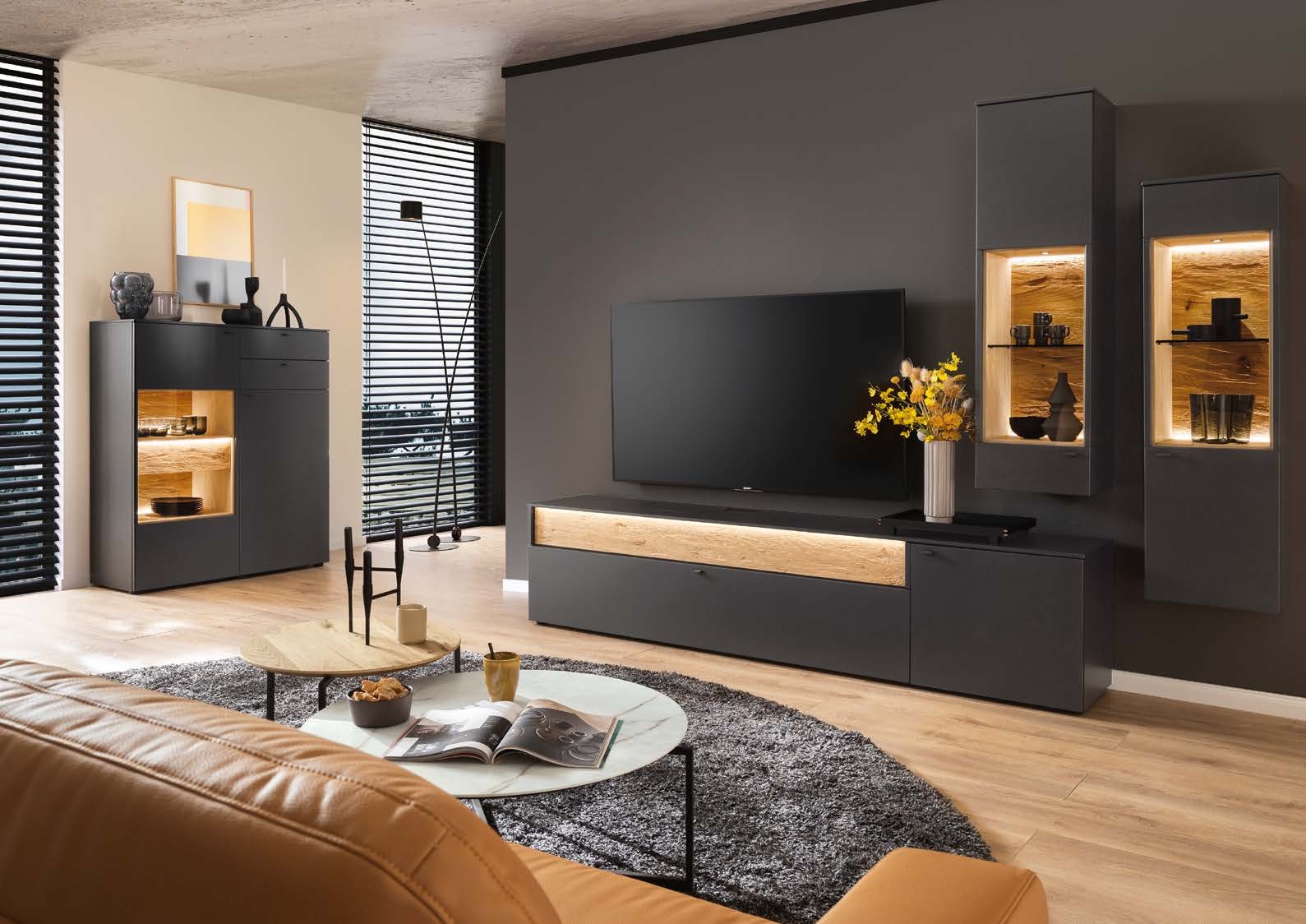 השילוב בין עץ אלון טבעי ומרשים, לקה מט בגוון אפור כהה עמוק וקונסטרוקציית מתכת דקיקה ומדויקת יוצר מראה אלגנטי ועוצמתי בו-זמנית. תאורה אינטגרלית ונגיעות גימור מוקפדות מדגישות כל פרט ויוצרות חוויית עיצוב שלמה.